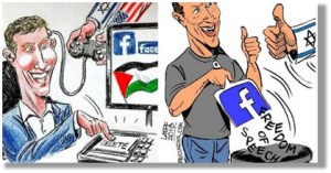 Eine weitere Karikatur zeigt Facebook-Mitbegründer Mark Zuckerberg wie er auf dem Bildschirm eine Fahne von Palästina sieht und dabei den »LÖSCHEN« -Knopf drückt und lächelt, während zwei Arme, eine davon mit dem Zeichen Israels, eine mit der US-Flagge eine Spielekonsole halten, deren Kabel im Kopf von Zuckerberg enden.